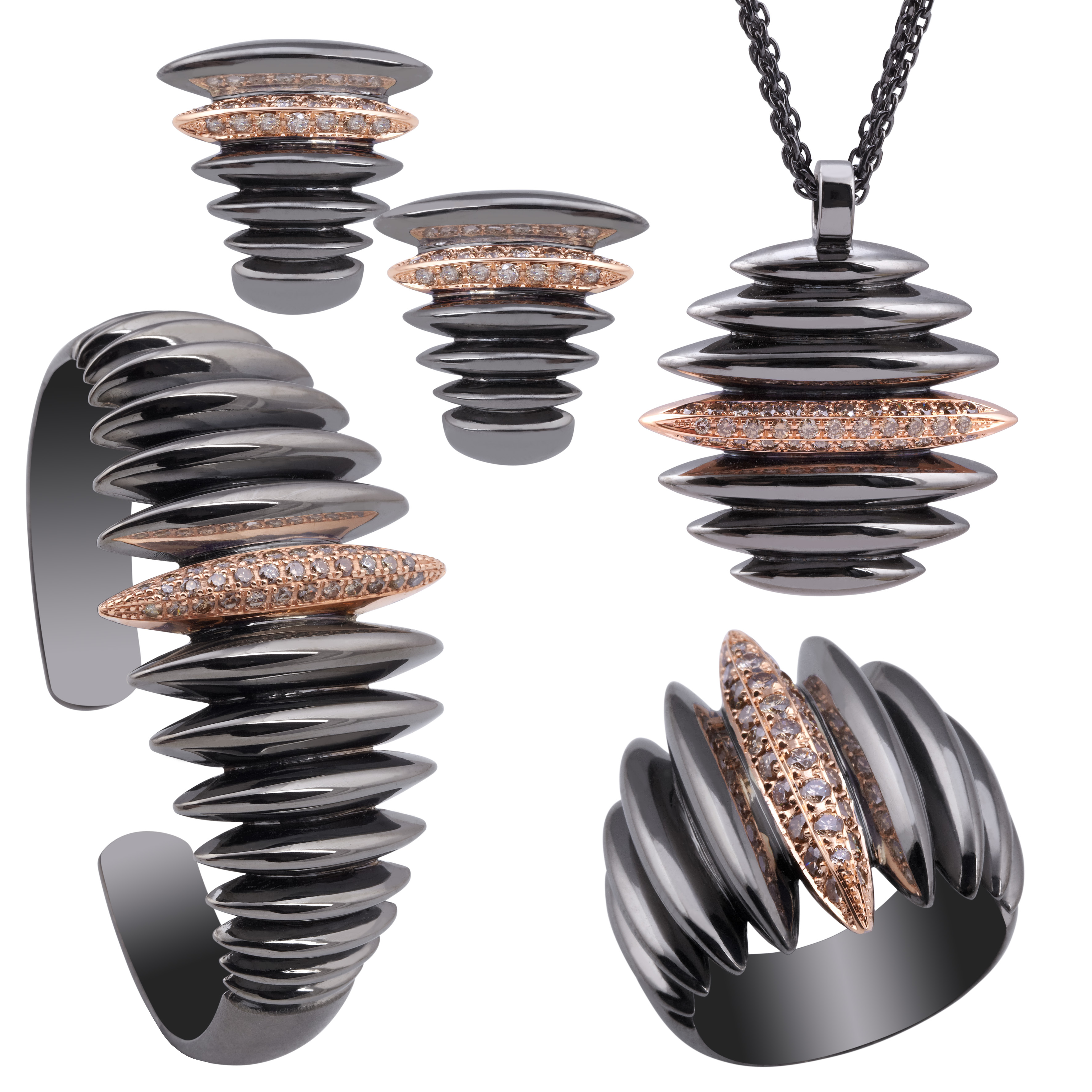 En esta ocasión se trata de una atrevida y llamativa colección diseñada en plata bañada en rodio negro, oro rosa y diamantes talla brillante marrones.