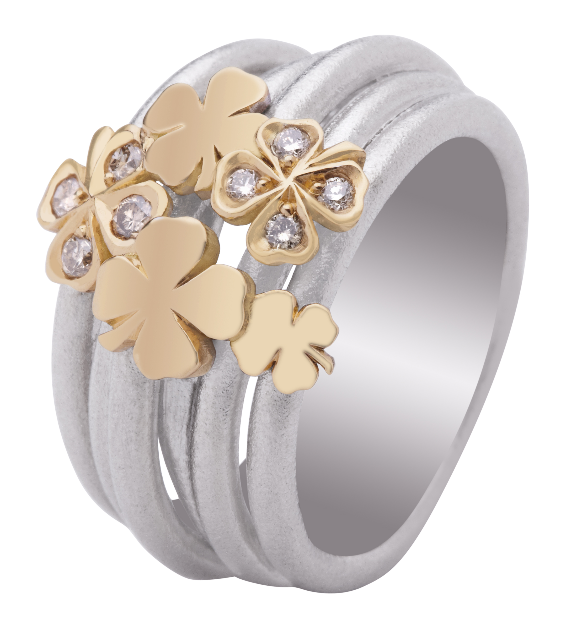 Quien encuentra un trébol de cuatro hojas tendrá buena suerte, todos lo sabemos. Lo que tal vez desconocemos es el sentido de cada una de sus hojas. Según la leyenda la primera hoja representa la esperanza, la segunda la fe, la tercera el amor y la cuarta la suerte. De forma que obsequiar a mamá con una sortija como ésta, diseñada por antonio soria es el mejor regalo para el día de la madre. La sortija es de plata y las hojas de trébol de oro amarillo y diamantes blancos. Su precio es de 620€.