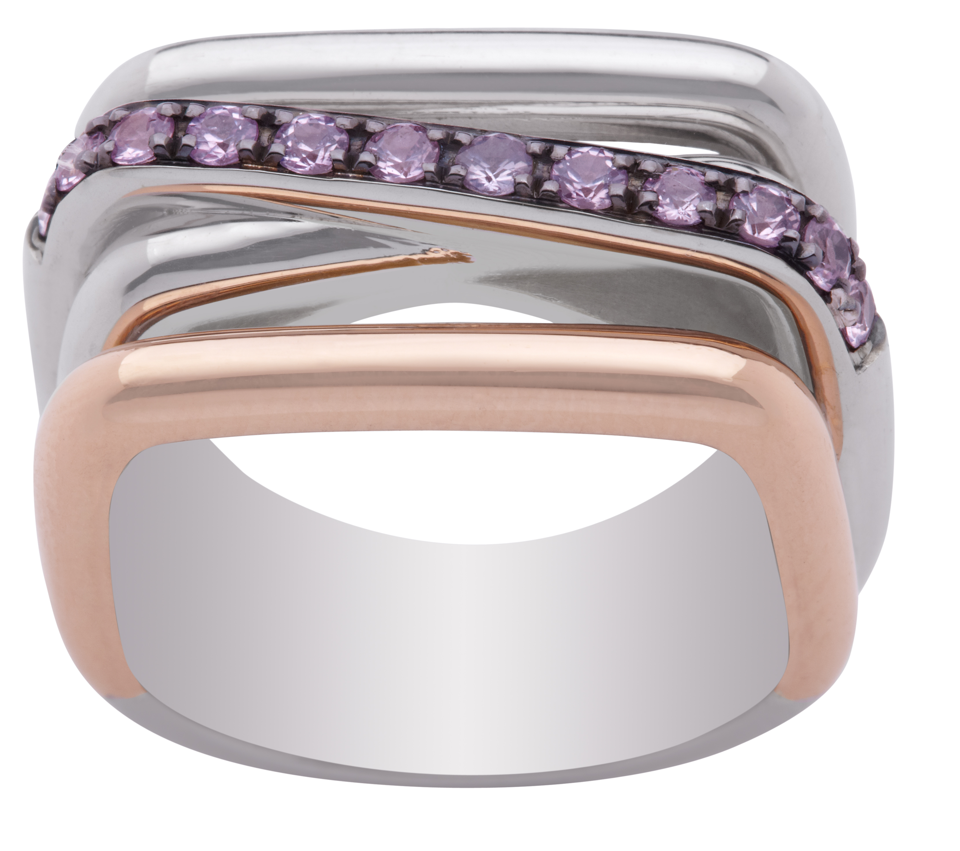- Sortija cuadrada de la coleccón Caché de antonio soria, diseñada en oro rosa, plata y zafiros rosas.