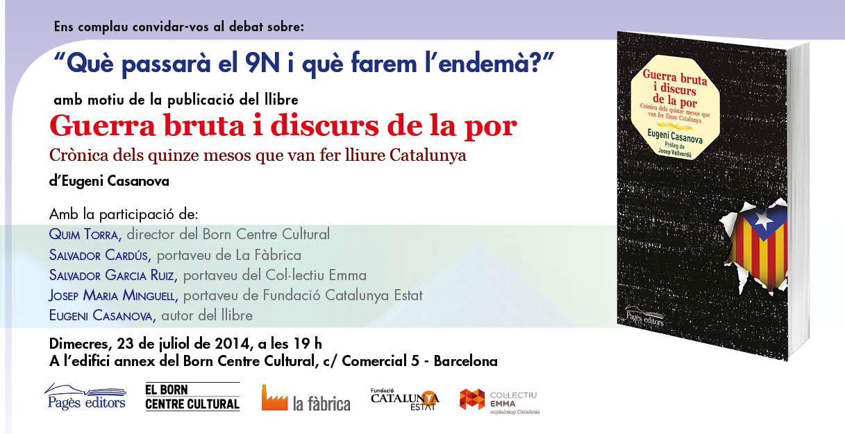 Dimecres 23 de juliol, a les 19.00h, tindrà lloc el debat «Què passarà el 9N i què farem l’endemà?» amb motiu de la publicació del llibre Guerra bruta i discurs de la por. Crònica dels quinze mesos que van fer lliure Catalunya», d’Eugeni Casanova.